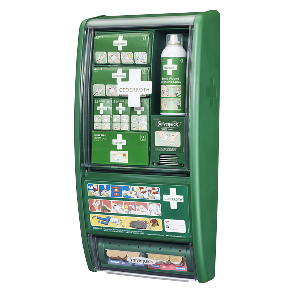 Vi erbjuder Första hjälpen stationer för god beredskap på er arbetsplats/verksamhet. Vi tillhandahåller förbandstavlor för första hjälpen och plåtskåp.